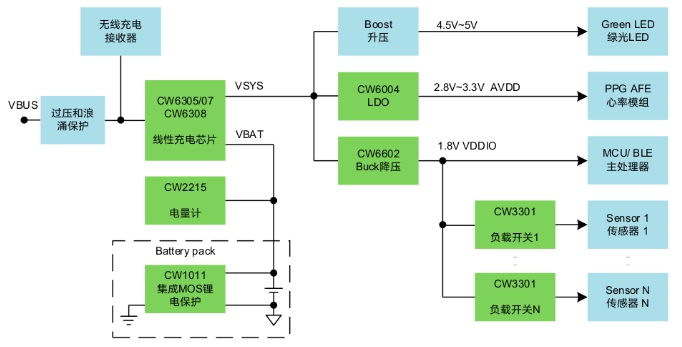 随着技术的飞速发展,智能指环作为新兴智能可穿戴设备越来越被品牌厂商所关注。中国穿戴厂商华米在CES 2024期间发布了名为Helio Ring的智能指环新品;韩国三星电子于2024年7月正式发售指环产品Galaxy Ring,市场反响热烈。智能指环既有装饰潮品的时尚属性,又是智能手机的辅助智能感知配件,用于人体健康数据的监测。相比手表和手环,指环更贴合皮肤,因此在收集人体基础生物信息,如脉搏、心率、血氧、心电图,以及监测体温等方面更有精准度优势。指环相比智能手表,还有无感佩戴的特点,更能满足用户的差异化需求。智能指环受限于空间尺寸,配备的锂电池容量通常在15~23mAh,而续航时间则需要达到5天或更久。因此,超低功耗且超小尺寸的芯片必为产品开发者所青睐。PA捕鱼官方网站电(CellWise)已经量产多款超低功耗的小尺寸电源芯片,如Figure1所示,都非常适用于智能指环应用。Figure 1.智能指环电源方案线性充电器-CW6308、CW6305/6307CW6308是一款支持I2C接口和电源路径管理的线性充电芯片,尺寸为业内最小,充电电流最大支持320mA。在仅有电池供电并开启Watchdog功能后,芯片工作电流仍低至5μA。CW6308还支持500nA超低功耗模式和300nA船运模式,封装为WLCSP-9,尺寸为1.24mm*1.24mm。CW6305/6307功能与CW6308一致,区别是可支持最大470mA充电电流,芯片封装尺寸为WLCSP-9,1.55mm*1.55mm。电量计-CW2215单节锂电池电量计CW2215的工作电流仅为5μA,是业内最低,内置高精度ADC,支持电压、电流和温度监测。芯片内置“FastCali”算法,结合对客户电池样品建模测试提取的电池特征参数,可完成对电池剩余电量(SOC)、循环数(Cycle)和电池健康(SOH)的精确计算,并可配置对低电量、高温或低温的情况进行中断上报。CW2215为WLCSP-9封装,尺寸为1.58mm*1.53mm。LDO低压差稳压器-CW6004CW6004是一款超低功耗LDO,静态工作电流低至300nA。其输入电压1.6V~5.5V,输出电压有1.1V, 1.2V, 1.5V, 1.8V, 2.5V, 2.8V, 3.0V和3.3V可选,输出电流为200mA。CW6004具有快速的动态响应特性,当设备从Standby轻载快速切换到Active重载的工作场景下,VOUT输出电压也能保持稳定。该芯片为DFN-4封装,尺寸为1.0mm*1.0mm。Figure 2.  CW6004静态电流vs输入电压Figure 3.  CW6004 Ground电流vs 输出电流Buck降压转换器-CW6602、CW6603CW6602是一款超低功耗Buck降压转换器,输入电压为2.15V~5.5V,输出电压为1.2V~3.3V共8档可选。其静态工作电流低至330nA,负载电流能力为0.6A/峰值电流1.0A。在1.8V输出电压时,芯片的重载效率达90%以上,100uA轻载的效率也可达85%。该芯片具有快速的负载动态响应能力,封装为WLCSP-8,尺寸为1.575mm*0.825mm。CW6603的功能和尺寸与CW6602一致,区别是输出电压范围为0.6V~1.2V。Figure 4.CW6602 Vout=1.8V的转换效率负载开关-CW3301CW3301是一款超低MOS导通电阻的负载开关,输入电压为1.1V~5.5V,最大通流能力2.0A。芯片的输出电压摆率(slew-rate)受控,有效保护后级芯片;CW3301具有业内领先的5nA On-State静态工作电流和12nA Off-state漏电流,并支持输出快速放电可选;其封装为WLCSP-4,尺寸为0.76mm*0.76mm。锂电保护-CW1011CW1011为单节锂电池保护芯片,支持高精度过压、欠压、充电过流、放电过流和短路保护。芯片内部集成了54mΩ导通电阻的Dual MOSFETs;其静态工作电流为2.5μA,并支持休眠模式,功耗低至20nA。CW1011的封装为DFN-6,尺寸为2.0mm*1.5mm。PA捕鱼官方网站电(CellWise)深耕超低功耗电源技术多年,在智能手表、TWS耳机、主动手写笔、无线蓝牙键鼠等可穿戴设备和数码配件上拥有众多design wins。今天介绍的这些电源芯片,一定也可以助力各品牌厂商和方案开发者,实现智能指环的更小空间堆叠、更长电池续航和更优用户体验。感谢大家对PA捕鱼官方网站电公司和产品的持续关注。